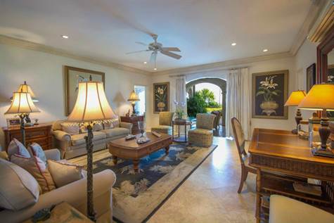 Situated on the exclusive Sandy Lane Estate and set amongst beautifully landscaped tropical gardens and within walking distance of the beach, shops, bars and exclusive beach-front restaurants is this spacious newly built seven bedroom house. This elegantly furnished two-story house was designed around the large swimming pool and decking area which provides a secluded and tranquil setting for relaxing in the sun by day and a truly magical ambiance for entertaining by night. The open plan design of the property ensures that each room flows onto the next and wherever you are you are kept cool by the continual sea breeze. The property has been tastefully furnished with a blend of modern and antique furniture along with European influences to provide a classical yet relaxing home. Attention to detail has been second to none and all tiling, fixtures and fittings are of the highest standard and quality. The bedrooms which vary between king, queen and twin are extremely spacious and include ceiling fans and air conditioning and most include dressing rooms, ensuite bathrooms, private safes and French doors which open onto either the secluded gardens, pool or decking areas. The large 10M x 16M pool includes a plunge pool area at one end with steps and a water volleyball and badminton court for the more energetic. Floating chairs and floats are also available. The fully air conditioned TV room with ceiling fans is large enough to comfortably seat eight people and there is a also fully equipped study with a computer, with broadband internet access, fax machine and copier. Additional internet access is available in the downstairs reception area. You enter the property via a grand reception entrance with a fish tail palm tree which leads into a stunning open plan living room with over twenty foot high ceilings. The living room includes elegant yet comfortable sofas and armchairs as well as a Squire & Longson baby grand piano.