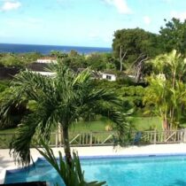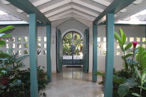 A prestigious home, nestled in tropical landscaped gardens on a prime 1.5 acre elevated breezy site, enjoying West Coast sea views and uninterrupted Country Club golf views to the east. Secluded and private, yet minutes away from West Coast’s fashionable shops and restaurants and other amenities. The entrance hall leads into the grand living room with vaulted ceiling and hardwood floors, ideal for entertaining. Adjacent is the al fresco dining Pavilion with views of the sea, pool and garden. There is a large granite countertop in the kitchen, with a walk in laundry area leading to a drying yard and detached self contained staff cottage. Located just off the kitchen is an informal breakfast and BBQ terrace with garden and sea views. All five bedrooms have en suite bathrooms, the master suite is located on the entire first floor and includes a dressing room with extensive views. All bedrooms in the northern wing overlook the pool and garden with views to the sea. The gazebo also overlooks the pool and west garden. The detached and self contained staff cottage could make another bedroom suite. This total of approx 6,000 sq ft of living space also includes other features like a two car garage with tool room, storeroom and underground irrigation tank. Hurricane shutters. Pool heater for all year swimming. Landscaped grounds containing mango, coconut, and other fruit trees. Standby diesel generator. CCTV security system. Ample parking. A 6.25 kw solar electricity system has recently been installed. This villa enjoys its own cabana at the Sandy Lane Property Owners Beach Club. Tennis and golf facilities are at the nearby Sandy Lane Hotel.